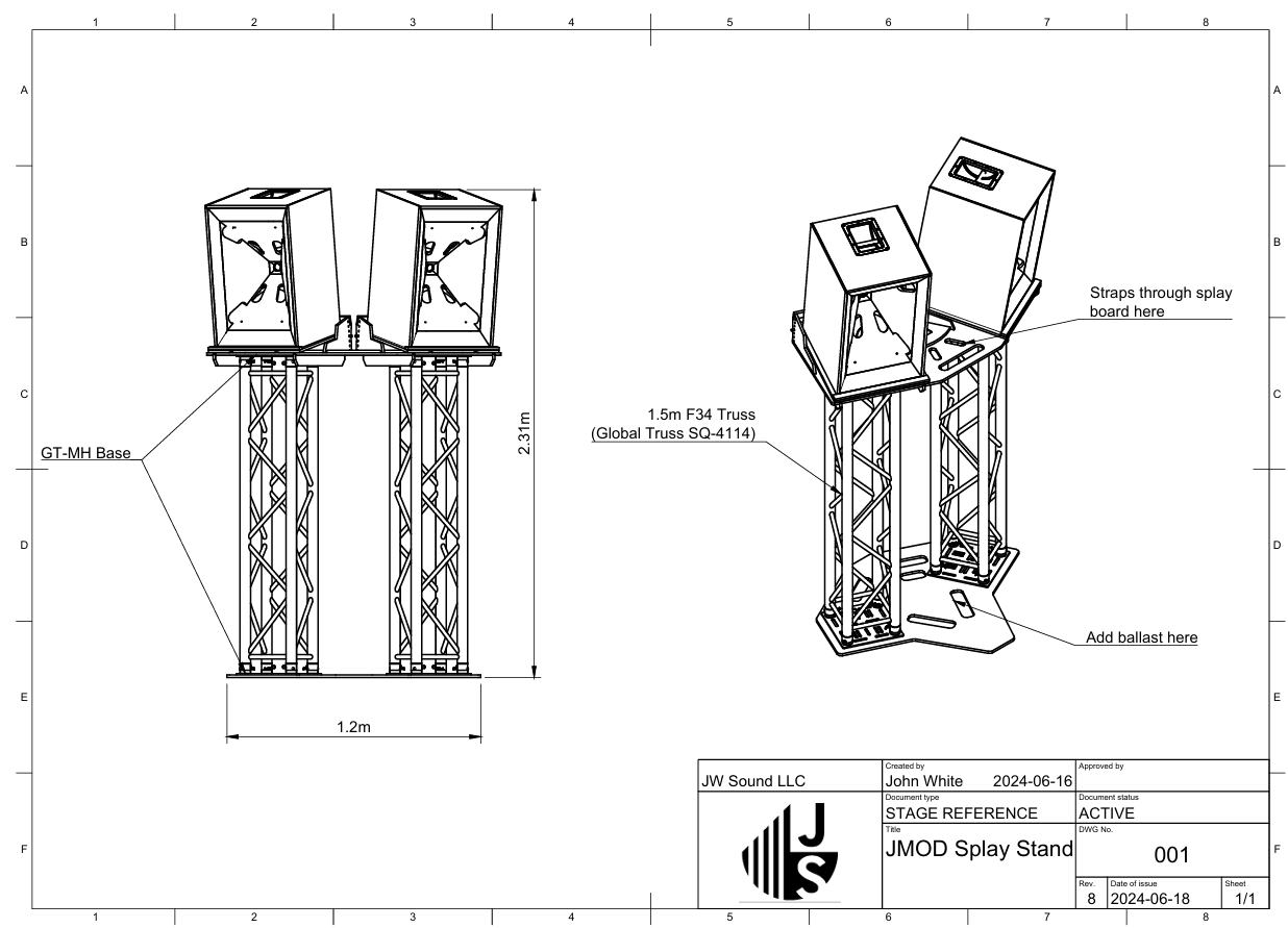 One-off design for a project that allows optimal angle of up to 4 JMOD boxes. The stands feature adjustable tilt angles from 2 to 16 degrees and are affixed to standard F34 stage truss.